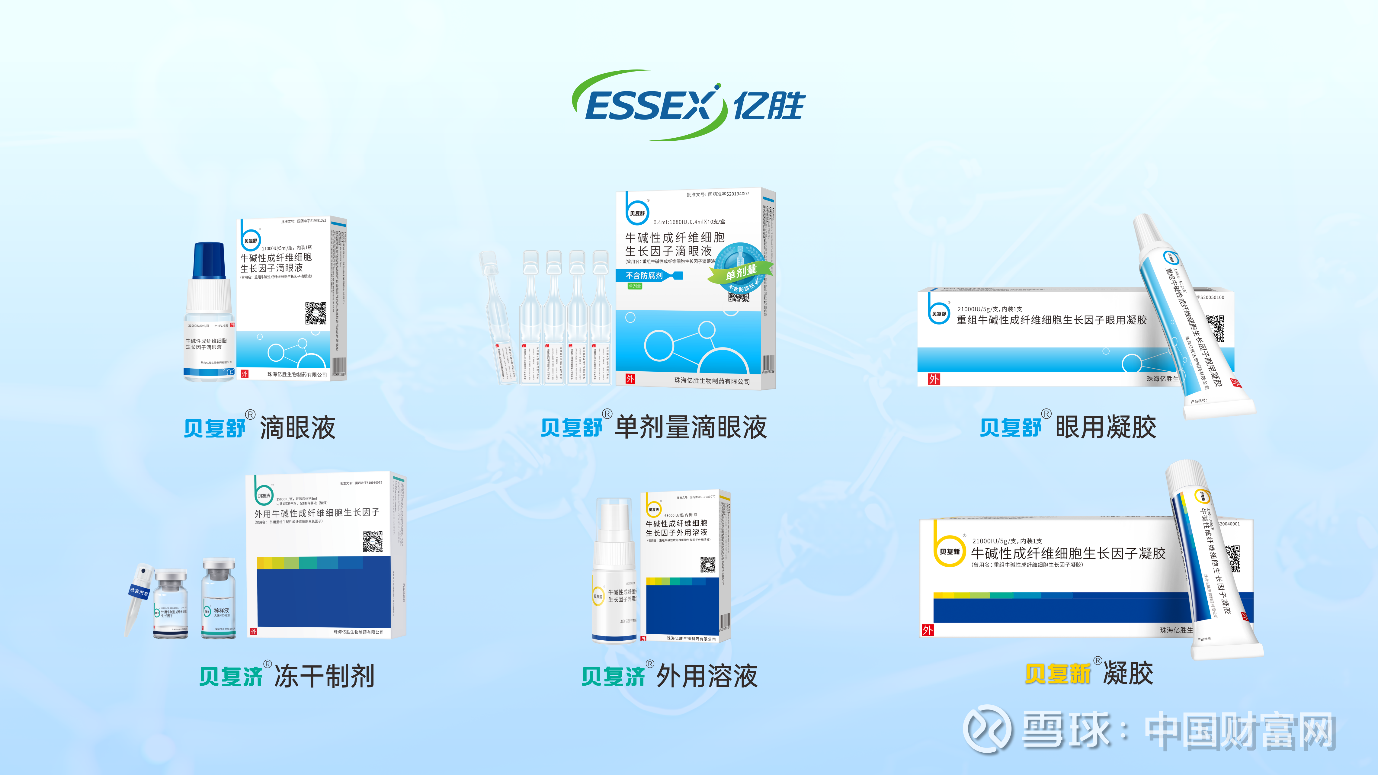 珠海亿胜自主研发的基因工程新药rb-bFGF系列产品,以其在眼科和皮肤科处方药领域创伤修复及疾病治疗的广泛应用而备受瞩目,系列涵盖贝复舒®、贝复济®、贝复新®三大品牌系列,共计6种剂型,其中三种为国家一类新药;贝复济®于1998年获批上市,是全球范围内首个获批的碱性成纤维细胞生长因子药品。珠海亿胜围绕rb-bFGF建立起完整的产业化体系,rb-bFGF产值规模位于全球前列。