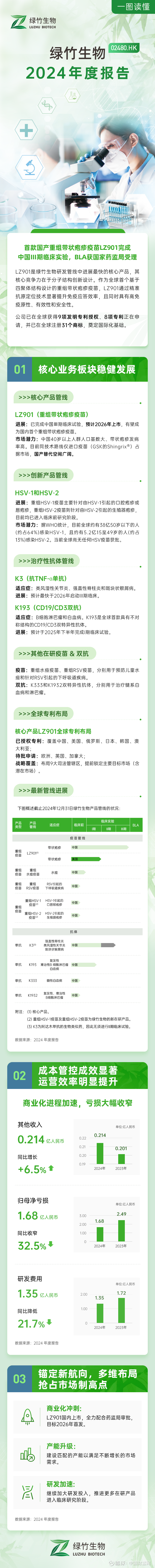 绿竹生物核心产品LZ901的BLA已于2025年1月提交国家药监局,并于2025年2月获受理,预计将在2026年上市,届时将标志着公司从研发向商业化转型的关键突破。