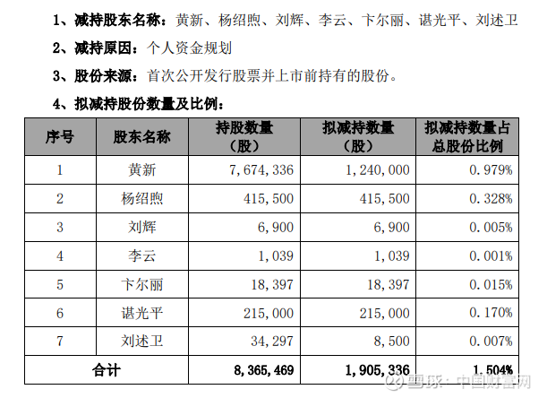 (300868)公告称,股东黄新、杨绍煦、刘辉、李云、卞尔丽、谌光平、刘述卫因其个人资金规划,拟合计减持不炒股,占公司总股本比例1.504%。