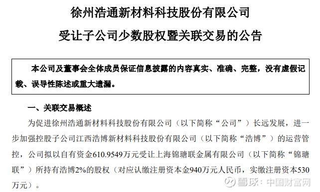 8月12日,浩通科技(301026)公告称,为促进公司长远发展,进一步加强控股子公司江西浩博新材料科技股份有限公司的运营管控,公司拟以自有资金610.9549万元受让上海锦瑭联金属有限公司所持有浩博2%的股权(对应认缴注册资本金940万元人民币,实缴注册资本530万元)。