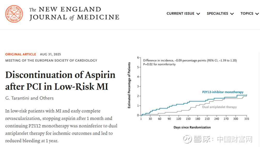 据微创医疗(00853.HK)官微消息,2025年8月31日,《新英格兰医学杂志》(NEJM)刊登了用微创®集团自主研发的Firehawk®/火鹰®冠脉雷帕霉素药物靶向洗脱支架系统(以下简称“Firehawk®/火鹰®支架”)进行的欧洲TARGET-FIRST临床研究全文;在西班牙召开的欧洲心脏病学年会(ESC 2025)以“最新突破性临床试验(HOT LINE)”专场同步发布了该项研究成果,即:对于植入Firehawk®/火鹰®支架达到完全血运重建的低风险急性心肌梗死(AMI)患者而言,双联抗血小板治疗(DAPT)疗程从12个月缩短至1个月,不仅没有增加缺血风险,而且还可大幅降低出血并发症。