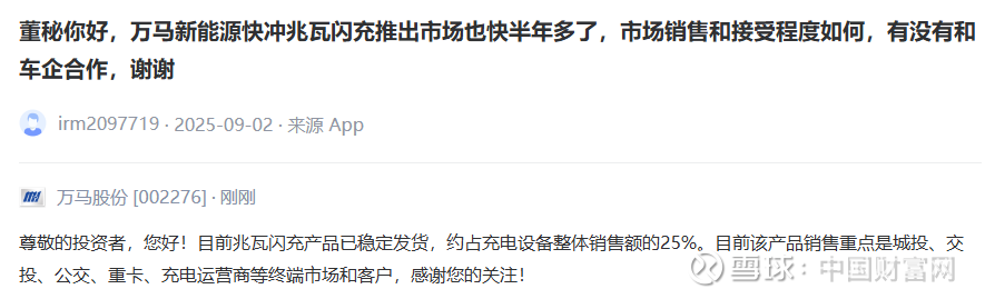万马股份:目前兆瓦闪充产品已稳定发货 约占充电设备整体销售额25%