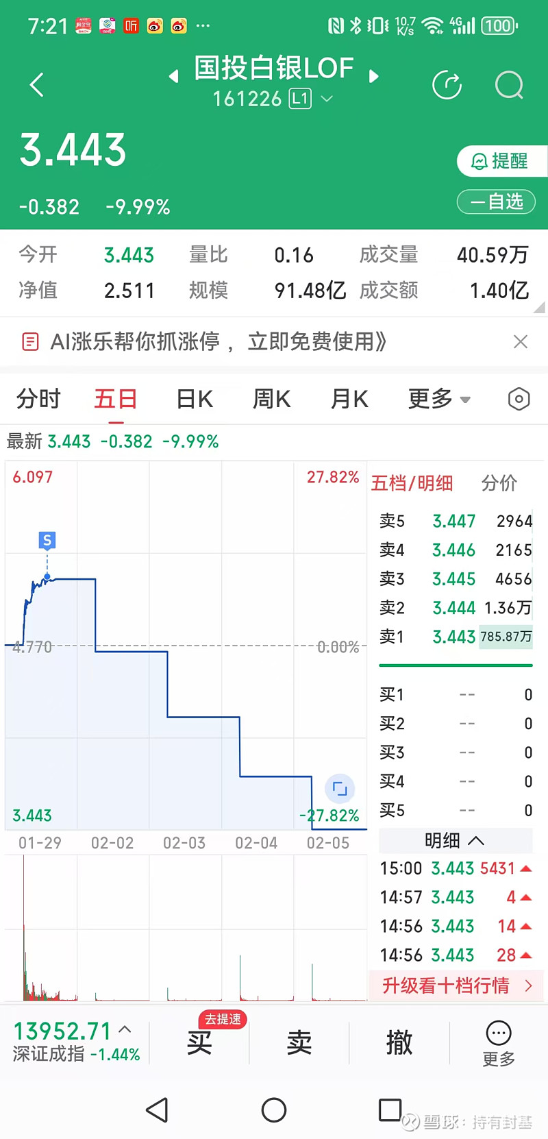 外盘白银还在跌,估计今天第五个跌停板逃不了了。