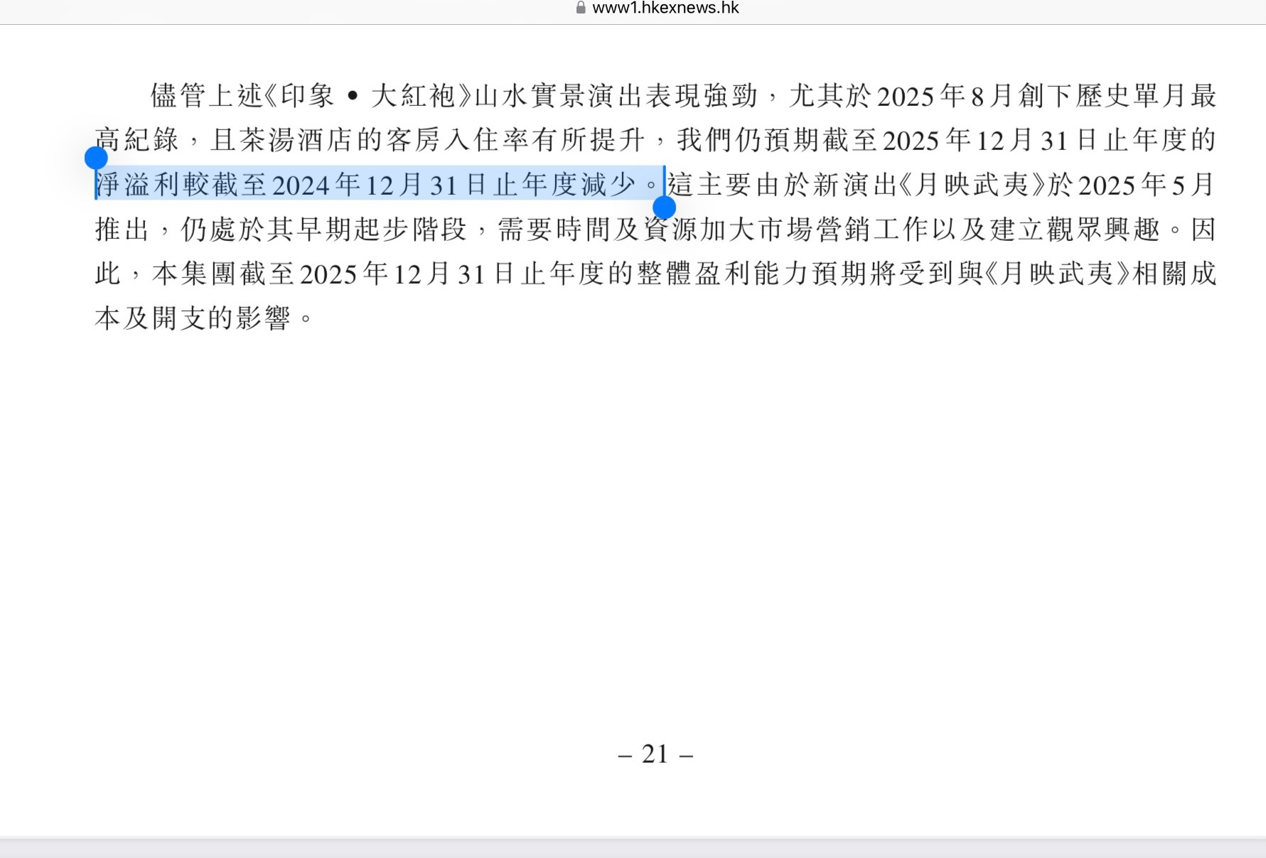 这是2025年12月12日发布的招股说明书的内容,再叠加最近大红袍官网的内容,那些说上市公司2025年净利润会创新高或者净利润暴跌只有1000多万的都是胡说八道。拆开来看,官网多次宣布核心大红袍项目的营收和利润创新高,我认为增幅有限可忽略不计。月映武夷项目财报显示半年亏了570万(收入230万,减直接成本410万,毛利润亏180万,再减开办费营销费管理费等390万,净利润负570万),全年我预计亏800万(收入1200万,减直接成本1200万,毛利润0,再减各项费用800万,净利润负800万),因只占40%股权,月映武夷项目影响上市公司归母净利润320万。香港上市费用影响上市公司归母净利润200万元。以上合计影响归母净利润520万元,故预计2025年净利润为4000万元,分配股息2500万元,税前股息率11%,税后股息率10%。
