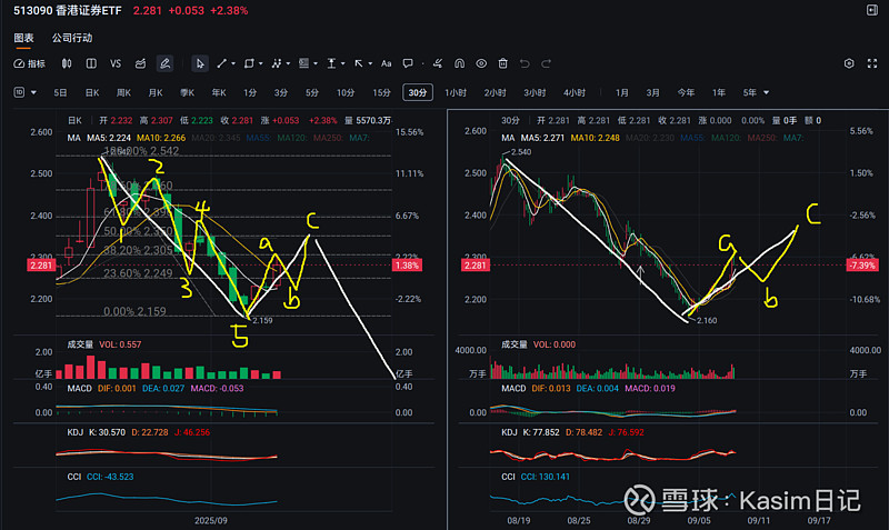 香港证券etf,今天这个阳线走出来之后,从日线看前面一波5波结构的下跌行情就确认被终结掉了,那么这个反弹大概率是要回补一半下跌幅度的,也就是要涨到2.350,通常这种第一波的下跌,反弹幅度会更高,对于该标的来说是反弹到2.396的位置附近,加上调整的预期在下周,所以本周目前这个标的应该还有上涨空间可以压榨,上午卖出是因为小级别出现了5波形态了,即黄色a浪可能随时完结,这个反弹大概率是要走3波结构的,而本周还有3个交易日呢,等它回踩下来,可以再用一部分仓位去玩玩,3成仓左右。止损位置也很明确,就是近期前低的位置。