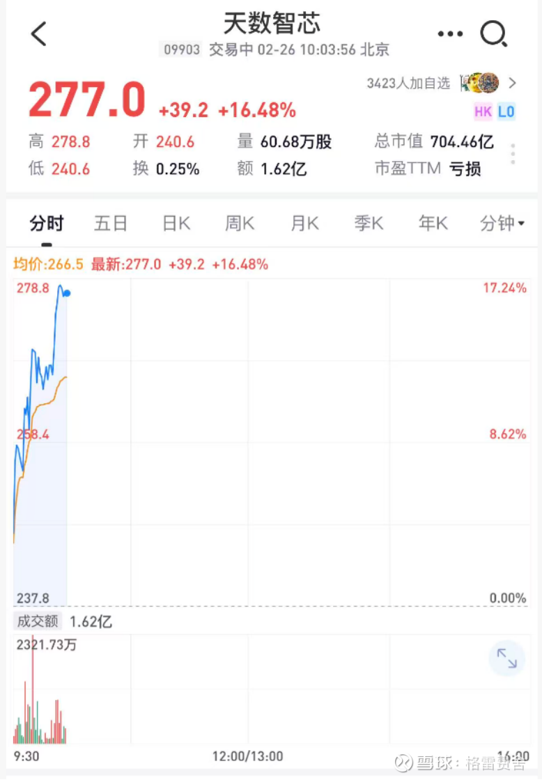 兆易创新涨3%,澜起科技、华虹半导体跟涨,但最扎眼的还是天数智芯——盘中一度涨超16%,收盘报277.0港元,把昨天那根阴线一口吞掉还带拐弯。
