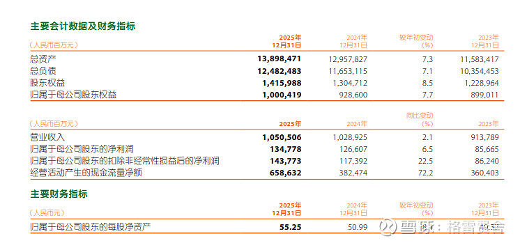 2025年,平安实现归属于母公司股东的营运利润1344.15亿元,同比增长10.3%;个人客户数达到2.51亿,较年初增长3.5%;寿险及健康险业务保持高增长态势,新业务价值达成368.97亿元,同比大增29.3%;财产险保费收入3431.68亿元,同比增长6.6%;银行业务净利润426.33亿元,核心一级资本充足率9.36%,较年初上升0.24%。