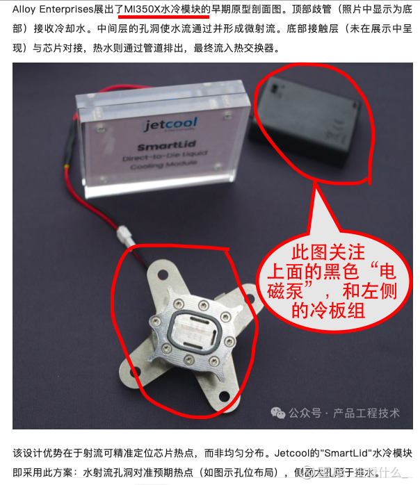 3、本图使用的JETCOOL展出的是早期原型样品设计,只是为了说明液冷模组的组成部分必须包括“液冷散热冷板组”、“电磁泵”。(JETCOOL的这个原型涉及比较特殊,它是冷体微孔喷射芯片直接散热方式)