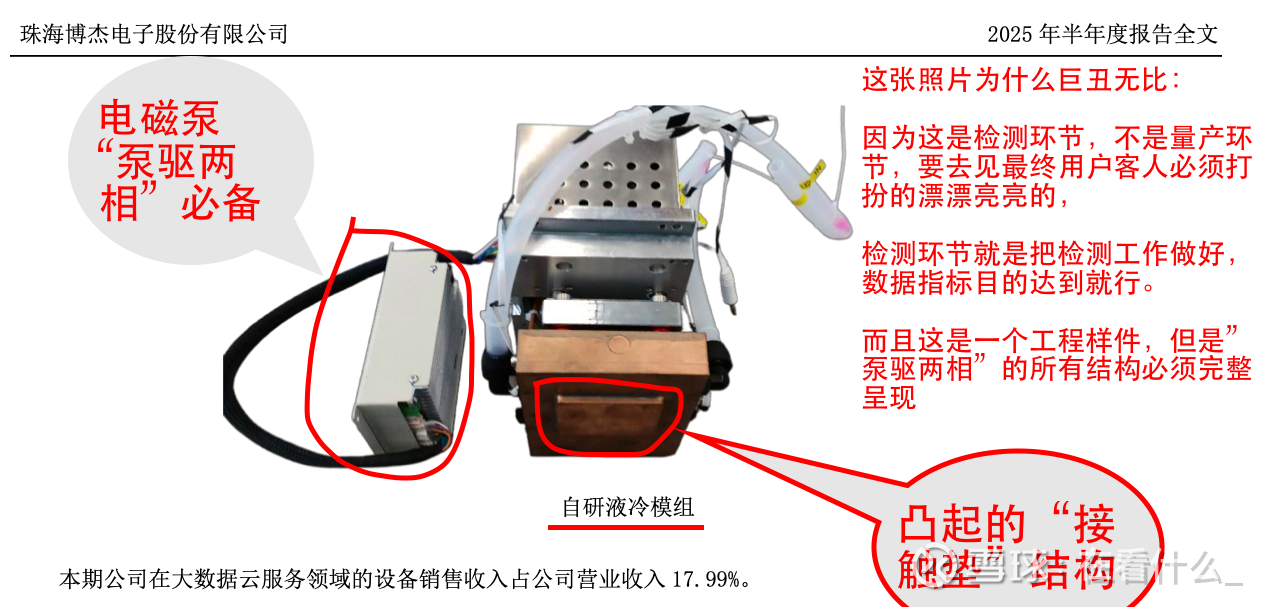 2、此图主要看两块结构,其一是上面那个黑色盒子,就是“电磁泵”,用于“泵驱两相”;其二就是左边的银白色冷板组。