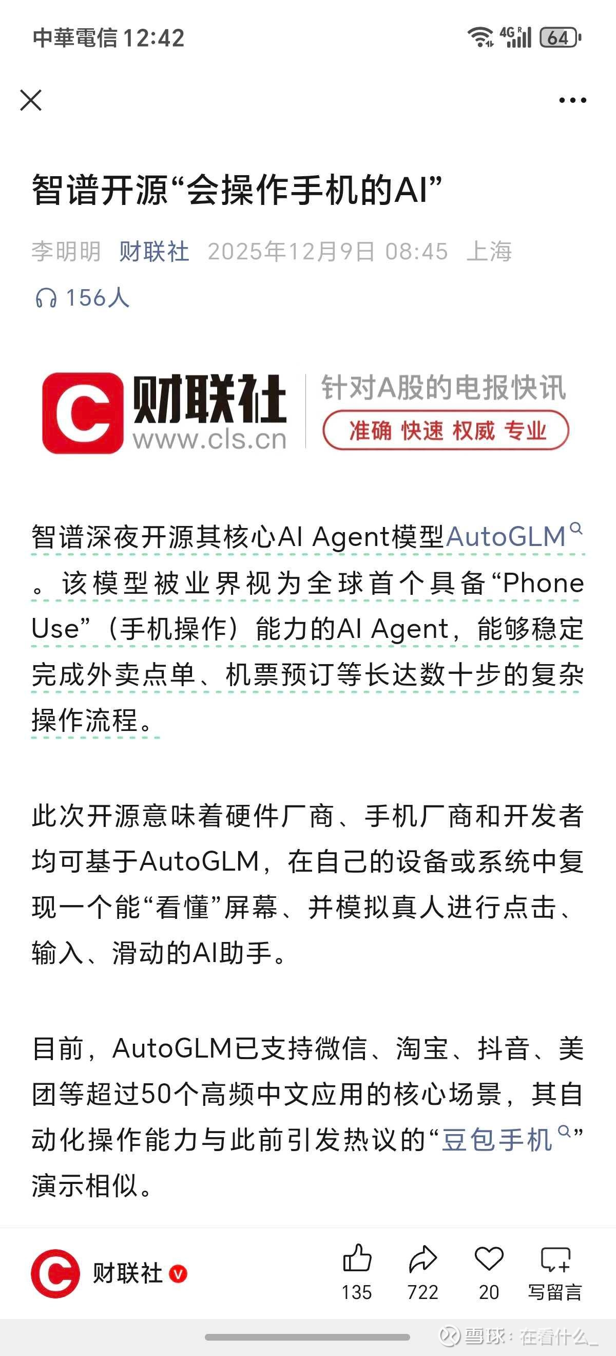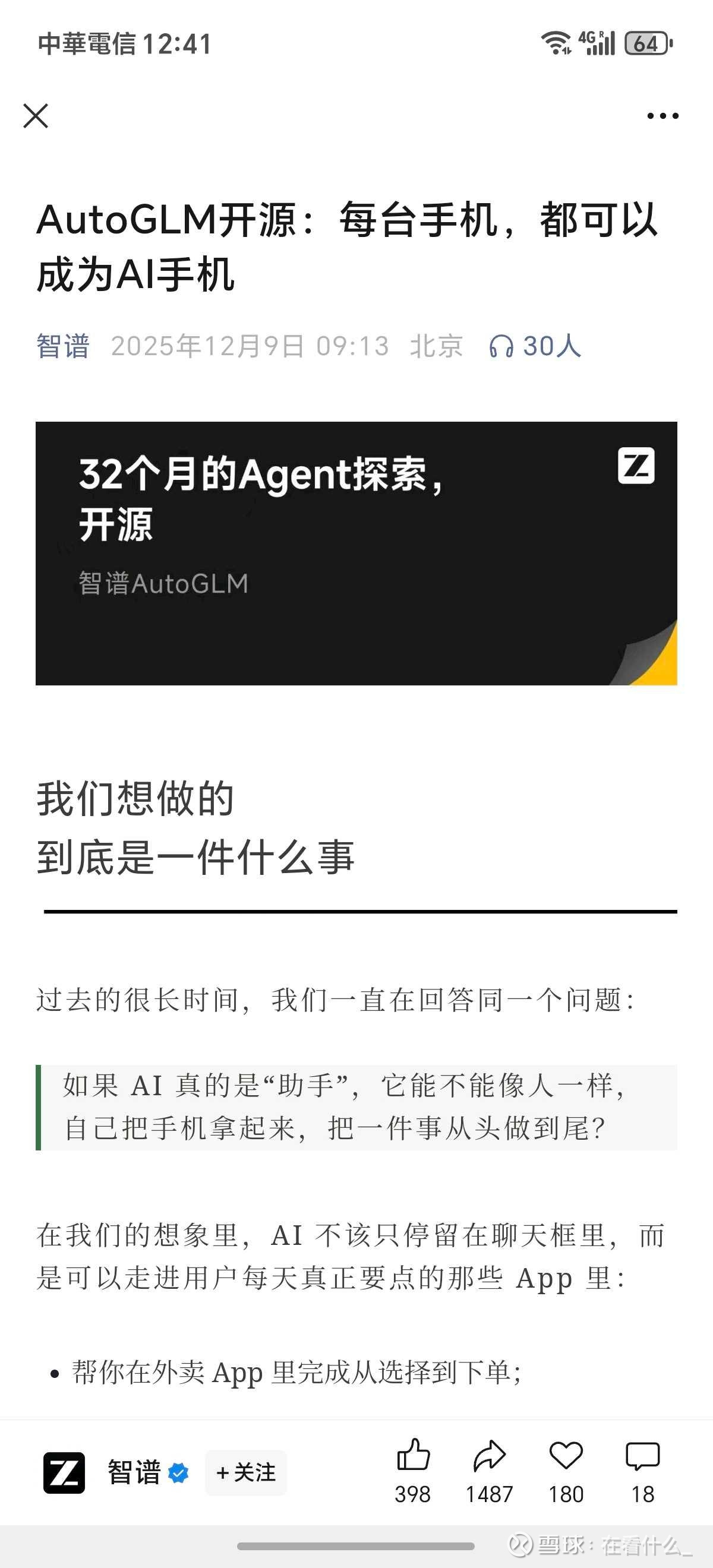 但是,这两天智谱AI推出了它的一个开源AutoGLM大模型,可以通过私有化部署在个人手机后,而不需要再购置专门的AI手机,完全达到与豆包手机一样的AI助理效果,