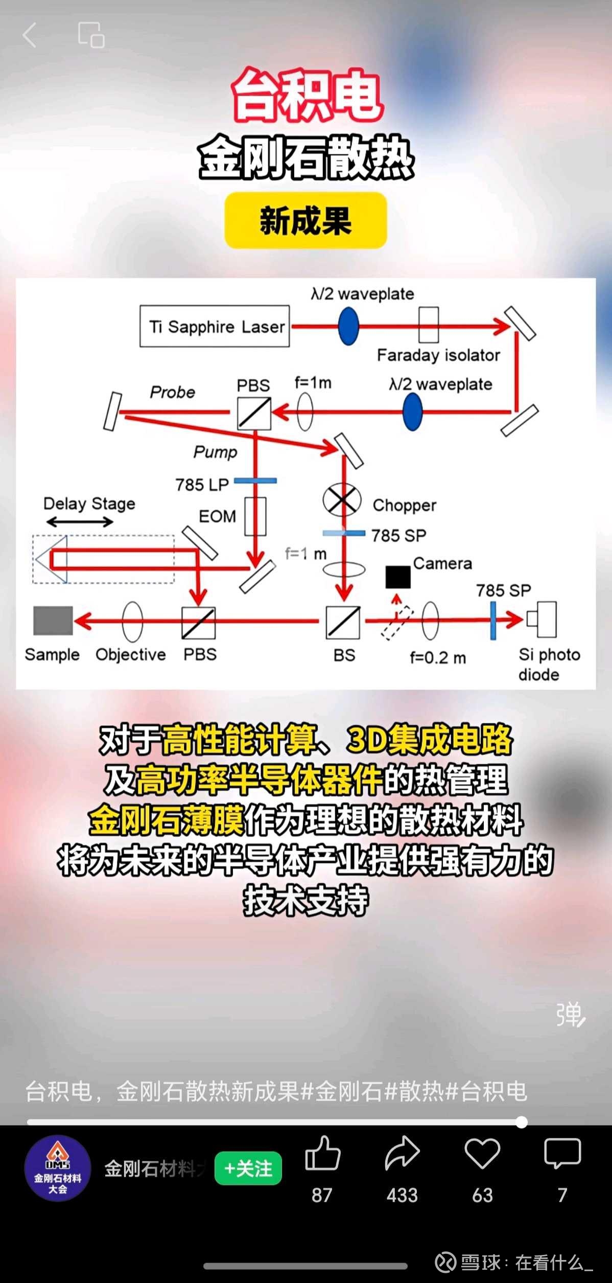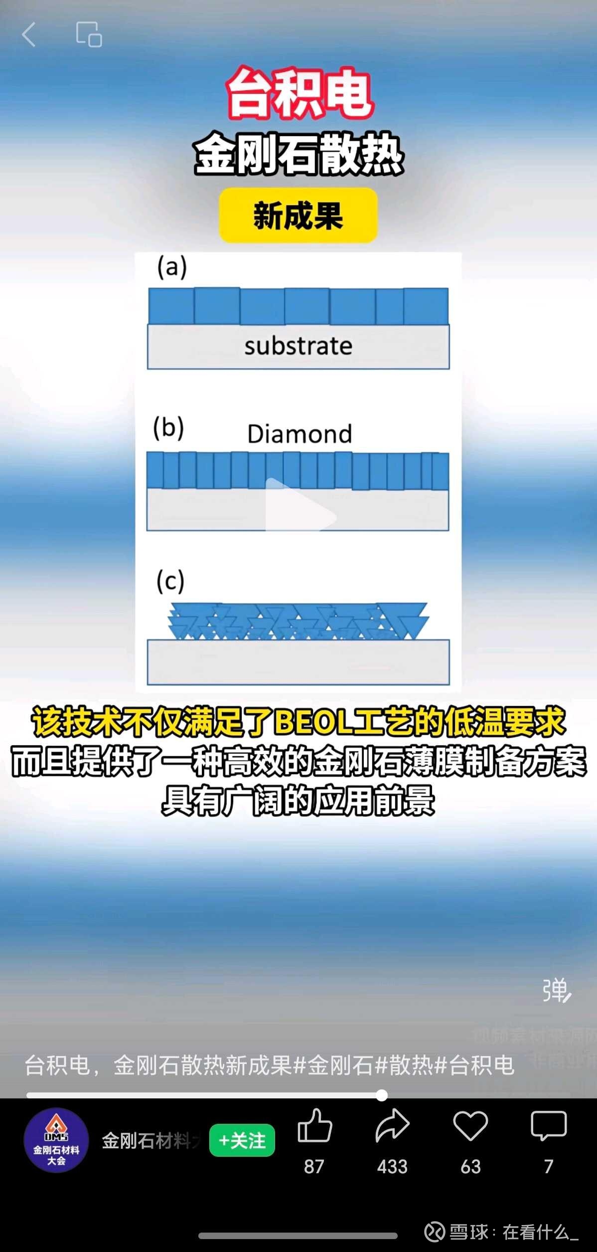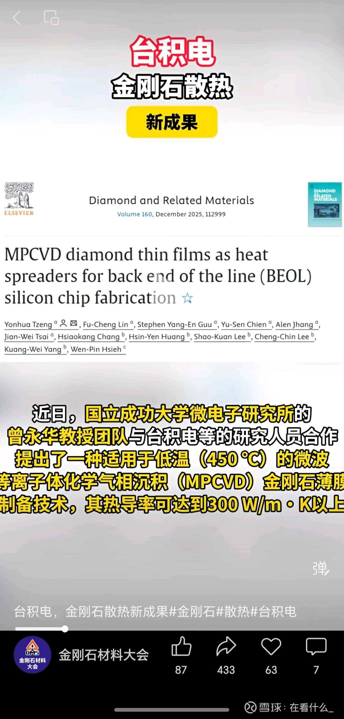 近日,国立成功大学微电子研究所的曾永华教授团队与台积电等的研究人员合作,提出了一种适用于低温(450 ℃)的微波等离子体化学气相沉积(MPCVD)金刚石薄膜制备技术,其热导率可达到300 W/m·K以上。
