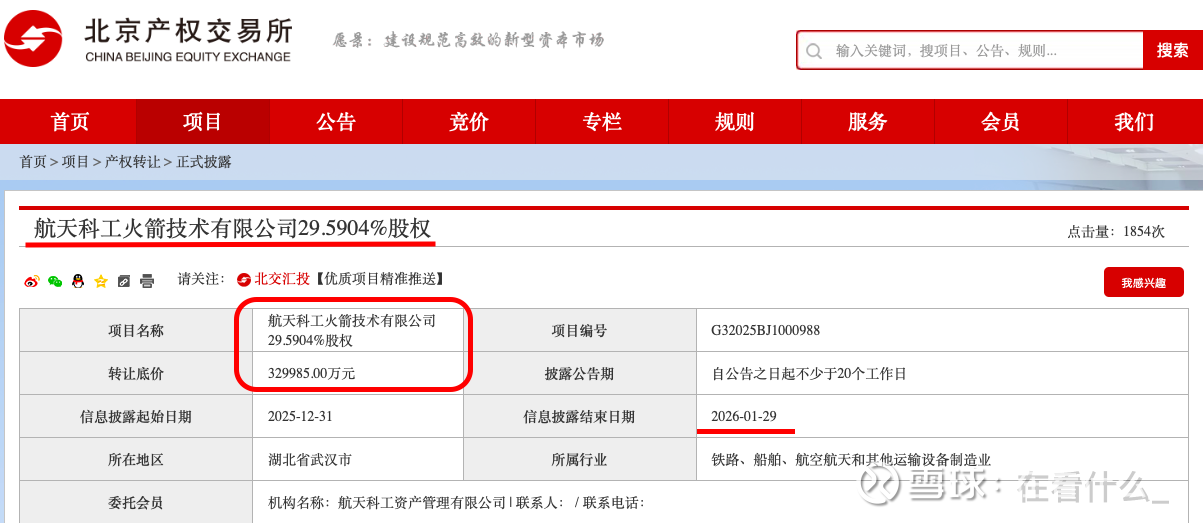 航天科工火箭29.59%股权,作价33亿元,在北京产权交易所公开挂牌转让。起始日期2025-12-31日,信息披露截止日:2026-1-29日