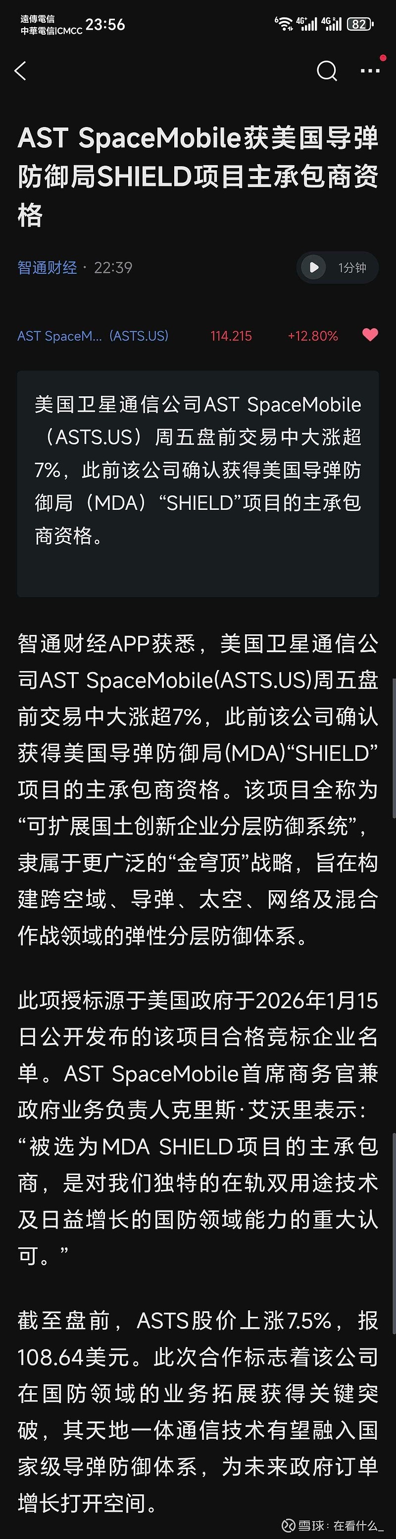 问个问题,为什么“导弹防御局”会给ASTS一个卫星通信公司订单,项目为什么叫“分层防御”。要知道,美国人做事从来都是讲在明面上。【美国卫星通信公司AST SpaceMobile(ASTS.US)周五盘前交易中大涨超7%,此前该公司确认获得美国导弹防御局(MDA)“SHIELD”项目的主承包商资格。该项目全称为“可扩展国土创新企业分层防御系统”,】