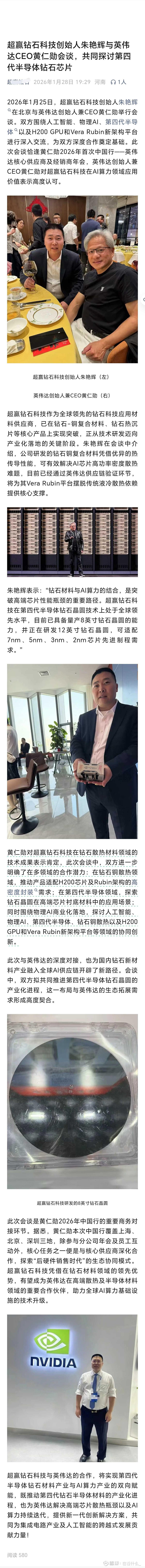 超赢钻石科技创始人朱艳辉与英伟达CEO黄仁勋会谈,共同探讨第四代半导体钻石芯片
