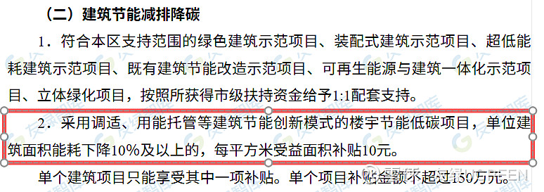 其中建筑节能减排降碳板块的两条政策形成鲜明对比:第一条针对绿色建筑示范、超低能耗建筑等“硬核技术”项目,给予市级资金1:1配套支持;第二条则专门针对“调适、用能托管等建筑节能创新模式”给予直接补贴。