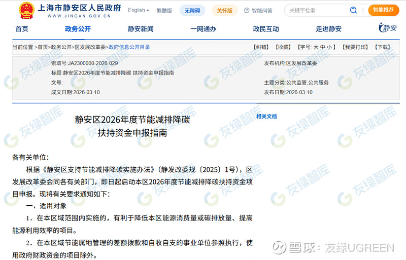 2026年3月10日,上海市静安区发展和改革委员会正式发布《静安区2026年度节能减排降碳扶持资金申报指南》(以下简称《指南》)《指南》共分十一大类扶持范围,涵盖产业、建筑、交通、循环经济、合同能源管理、可再生能源等多个领域。