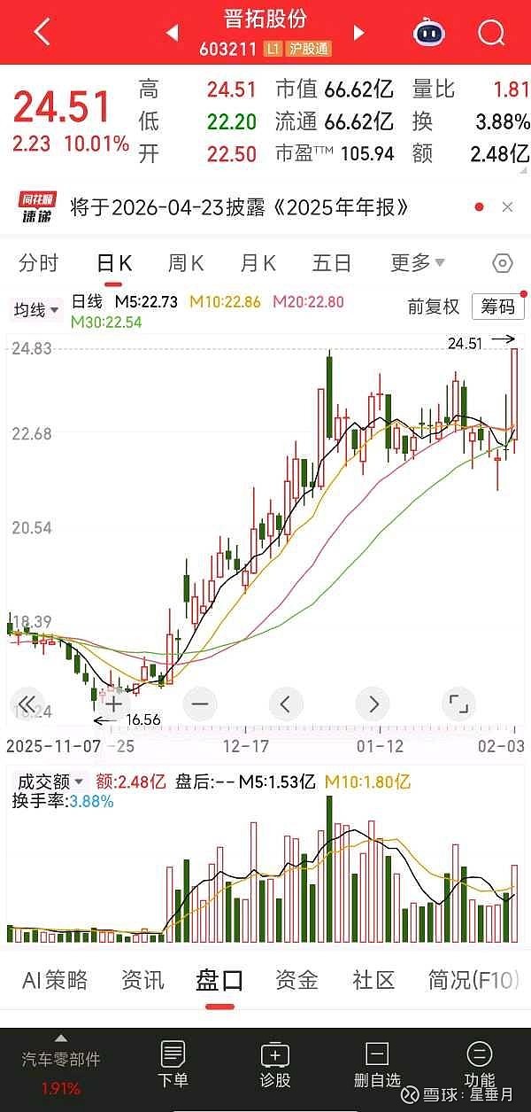 #2026交易错误思考# 晋拓股份,这笔尽管没有交易,但问题却暴露出来了,可以说拉升时候股价变动较快,但还是给了机会买入,可以说是自己的计划考虑不够全面,应该思考股价拉升较快时直接给合理的溢价买入,而不是现在在这里说暴露出问题,自己的水平还是太菜了!