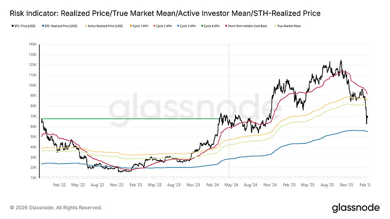 去年 10 月创下新高之后,大饼经历了三个阶段:先是急跌,反复测试真实市场均值;然后横盘到今年 1 月底;最近是第三阶段——跌破真实市场均值,加速往 6 万美元走。