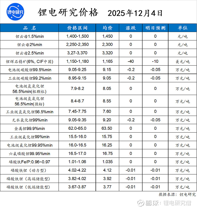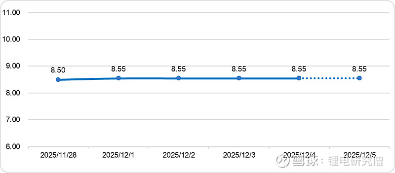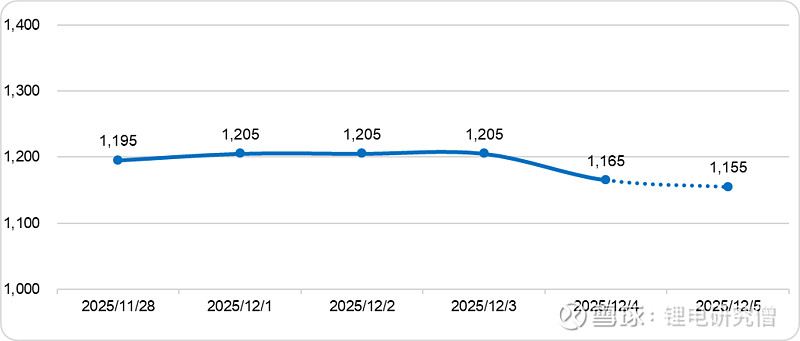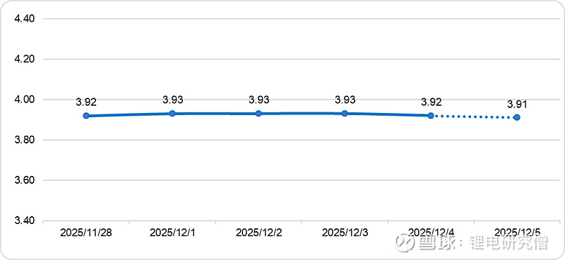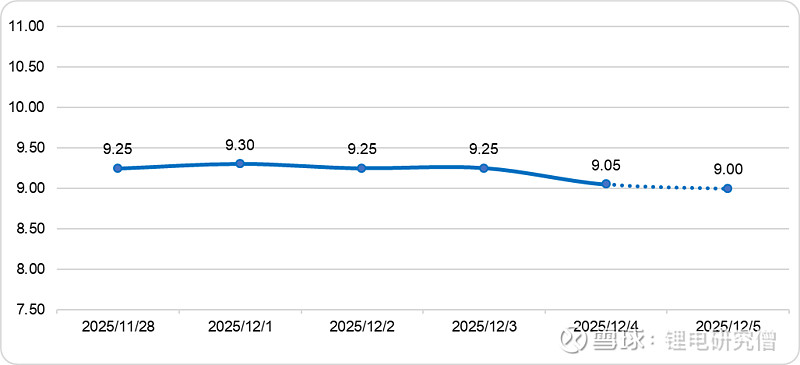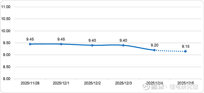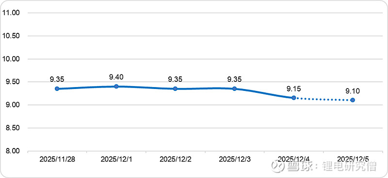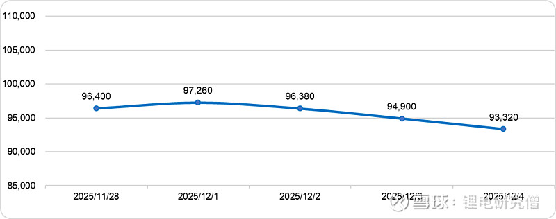 【摘要】碳酸锂期货价格日跌1.26%至9.33万元/吨,碳酸锂现货、进口锂辉石精矿、氯化锂和铁锂价格小幅走低;新能源汽车头部企业销量放缓,带动动力电池12月订单量下降,储能装机增速也大幅回落,碳酸锂消费缩量;江西枧下窝矿已于月初复产,且锂精矿进口量环比增加,碳酸锂供应量预计增加;供强需弱背景下,碳酸锂价格预计将区间偏弱震荡;鉴于生产商成本支撑,预计跌幅有限。