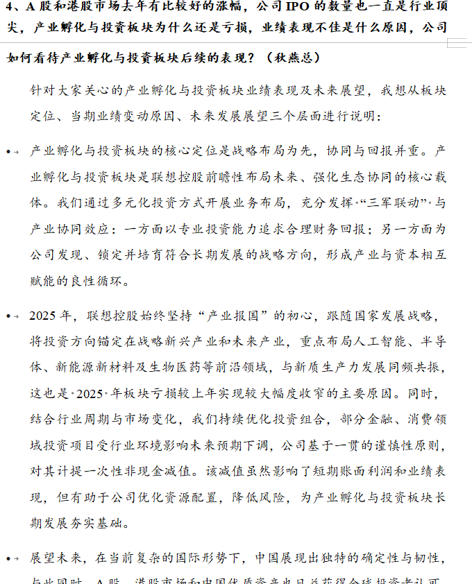 回复@笨笨的投资者2: 是的,联想集团只需要跟踪它业务的变化,从财报里可以推断出一些发展的趋势。 而联想控股的变数比较多,但其实追踪起来也不难。 从报表看影响业绩的几大主要公司的发展大概就可以判断,唯一难的就是产业孵化与投资这块,但从管理层的业绩沟通会的表述来看,这块也是一直在变好的,目前是这样。查看图片//@笨笨的投资者2:回复@杨饭:股价空间来说控股比集团肯定更大一些。但是不确定性也高一些。跟踪控股需要更全面的讯息和知识,但是搞好了收益也更大