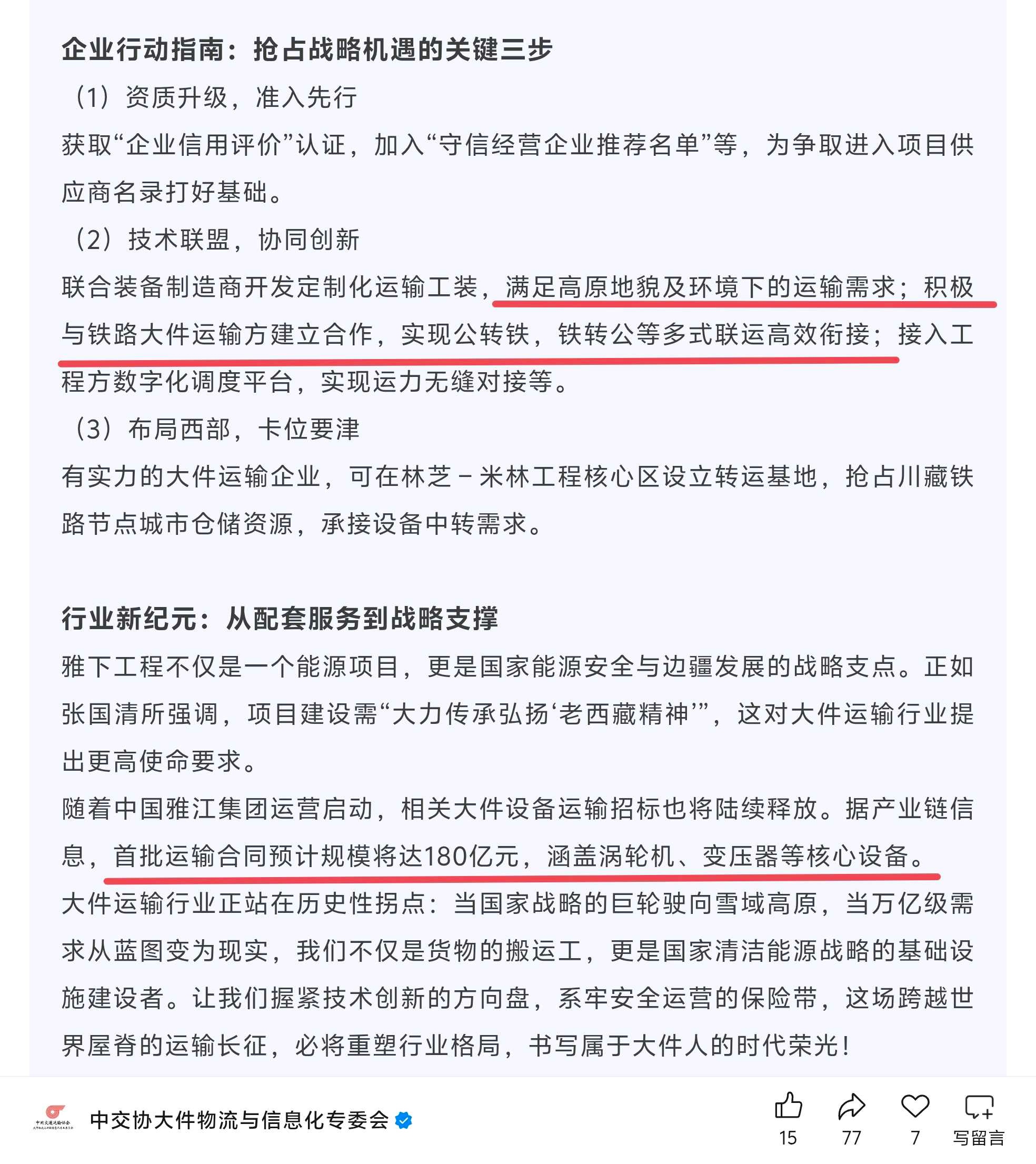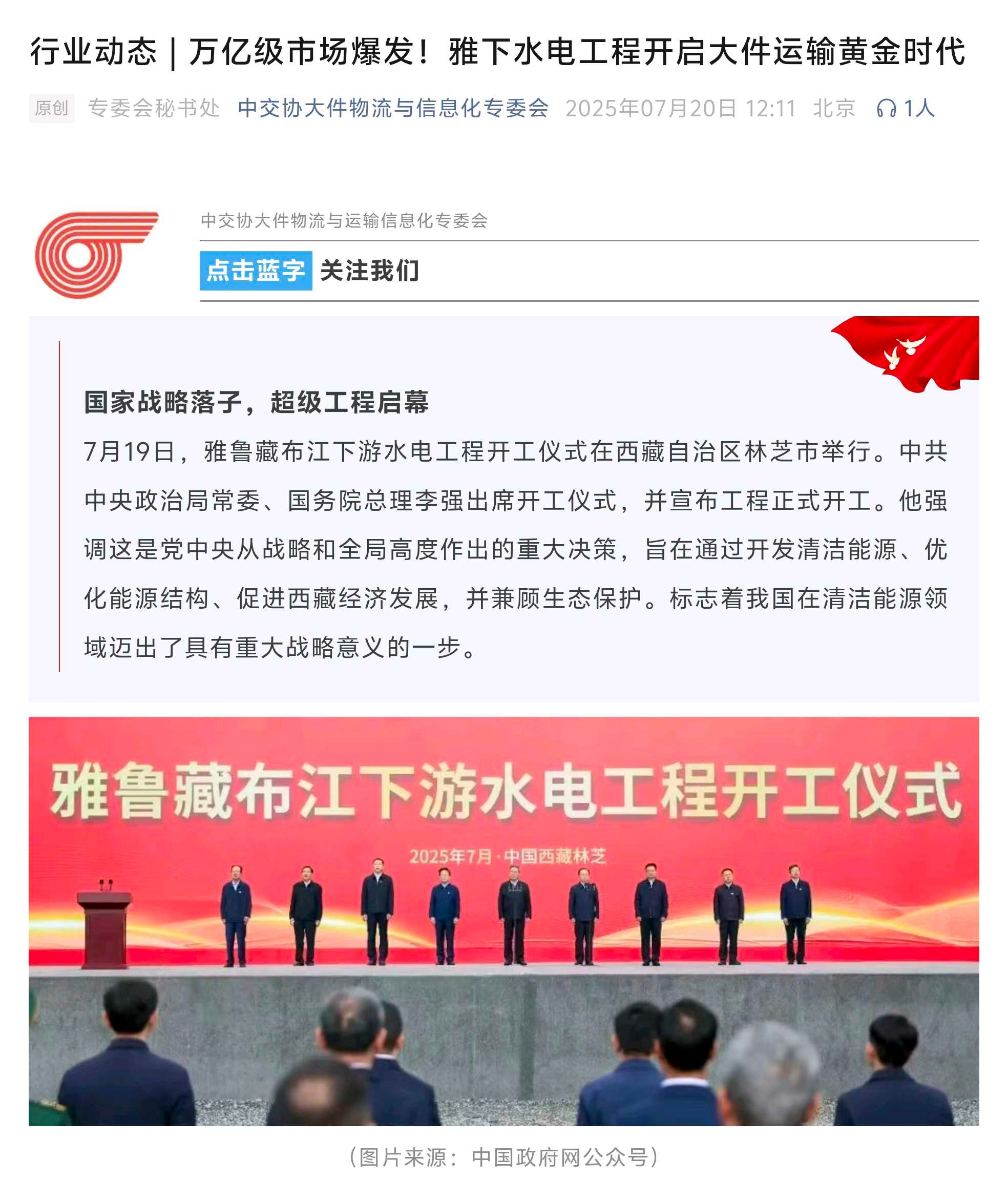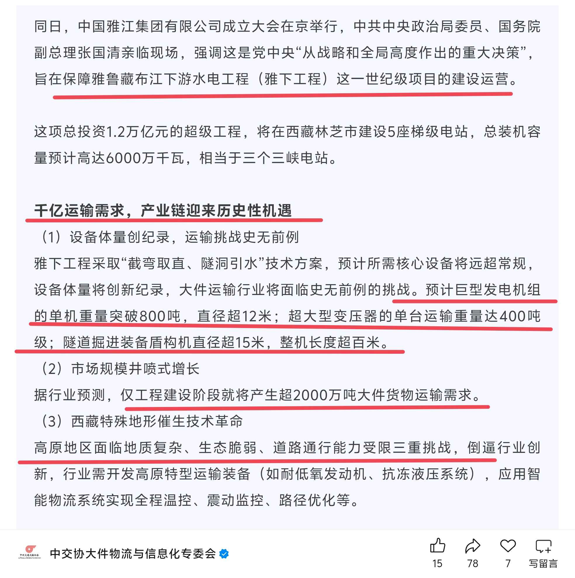 保障雅鲁藏布江下游水电工程(雅下工程)这一世纪级项目的建设运,千亿运输需求,产业链迎来历史性机遇,大件运输行业将面临史无前例的挑战。预计巨型发电机组的单机重量突破800吨,直径超12米;超大型变压器的单台运输重量达400吨级;隧道掘进装备盾构机直径超15米,整机长度超百米。据行业预测,仅工程建设阶段就将产生超2000万吨大件货物运输需求。高原地区面临地质复杂、生态脆弱、道路通行能力受限三重挑战,随着中国雅江集团运营启动,相关大件设备运输招标也将陆续释放。据产业链信息,首批运输合同预计规模将达180亿元,涵盖涡轮机、变压器等核心设备。
