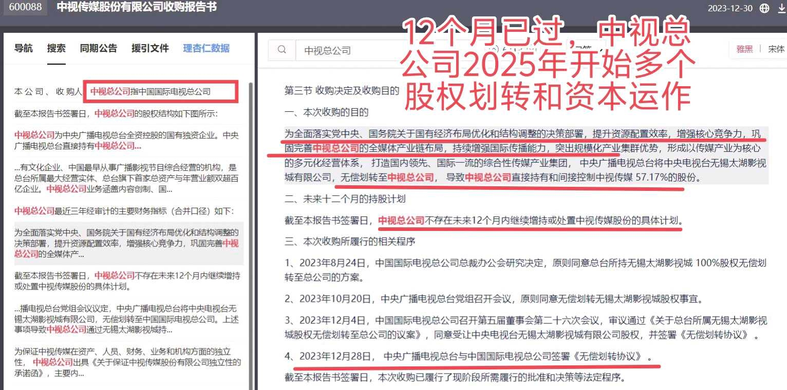 今年是时隔多年央视总台6–8月连续资本运作央视网和央视频股权划转,同时成立新直播电商平台央央好物,2023年12月中视传媒完成股权划转后已过12个月,央视总台极有可能开展资产重组完成资产证券化,一旦央视开启资产重组,可选只有中视传媒这个旗下唯一A股上市公司,最少几百亿估值资产的并购重组,流通市值不到30亿,近几年每年中视传媒都会因为央视资产重组预期有一波翻倍行情,今年已到九月,且央视旗下优质资产有了实质性的股权变更,中视传媒位置低有妖股特性具备爆发条件