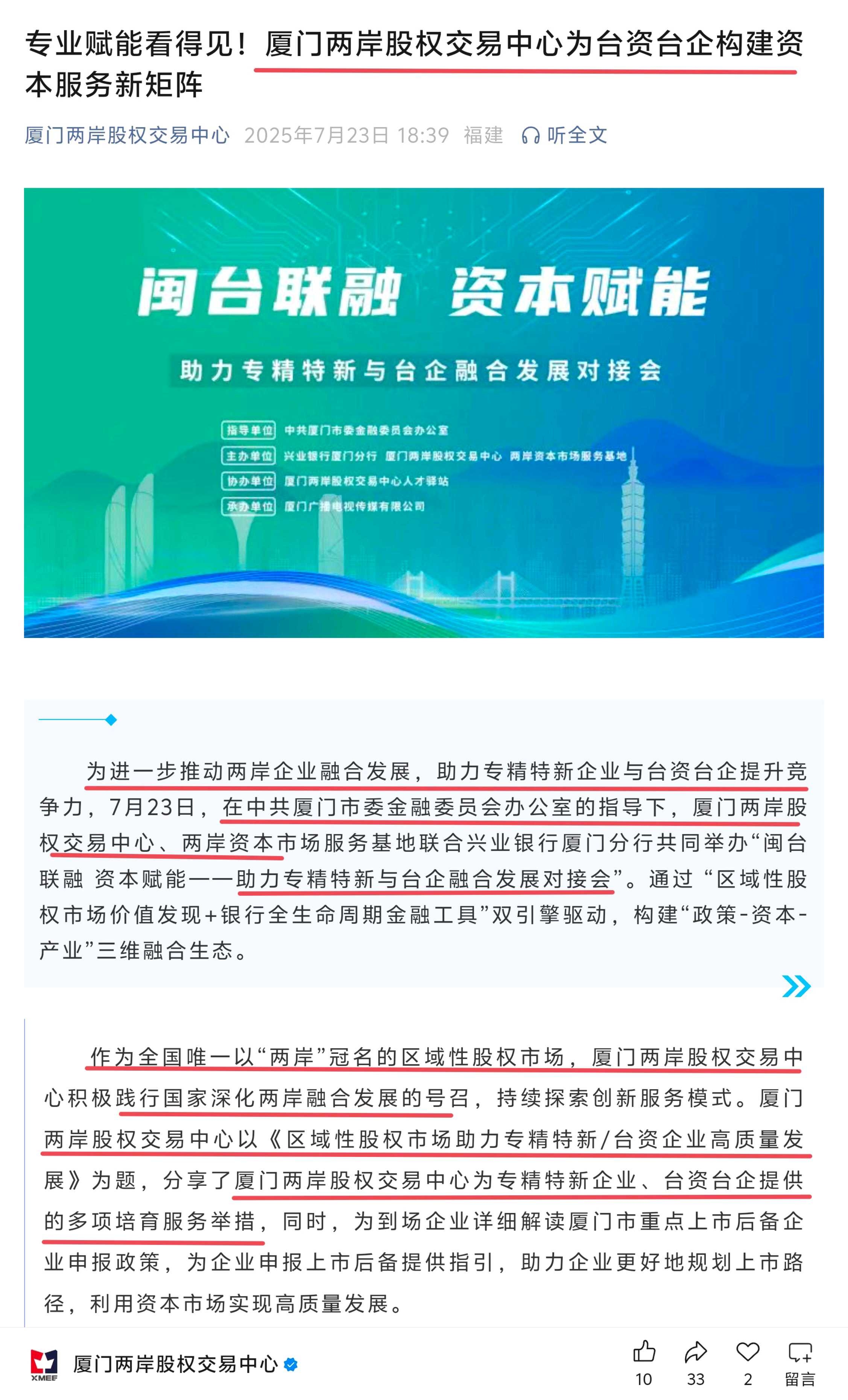 作为全国唯一以“两岸”冠名的区域性股权市场,厦门两岸股权交易中心积极践行国家深化两岸融合发展的号召,持续探索创新服务模式。厦门两岸股权交易中心以《区域性股权市场助力专精特新/台资企业高质量发展》为题,分享了厦门两岸股权交易中心为专精特新企业、台资台企提供的多项培育服务举措,同时,为到场企业详细解读厦门市重点上市后备企业申报政策,为企业申报上市后备提供指引,助力企业更好地规划上市路径,利用资本市场实现高质量发展。