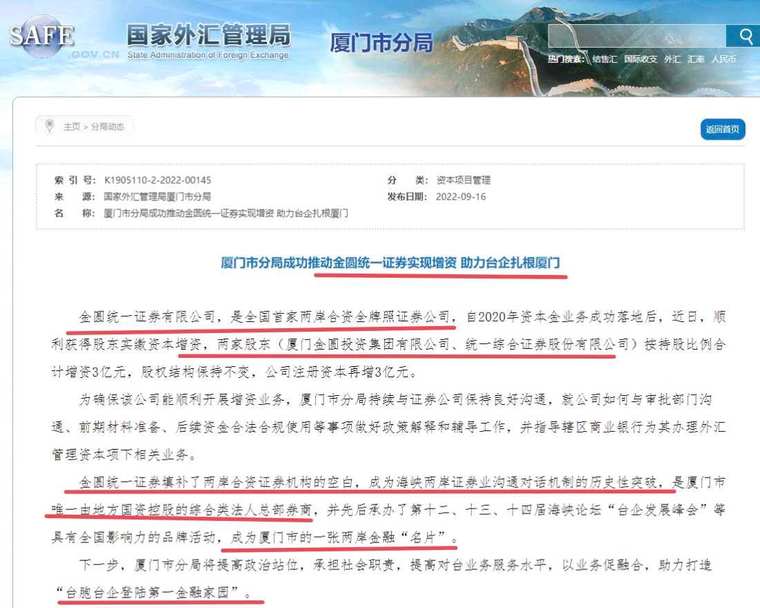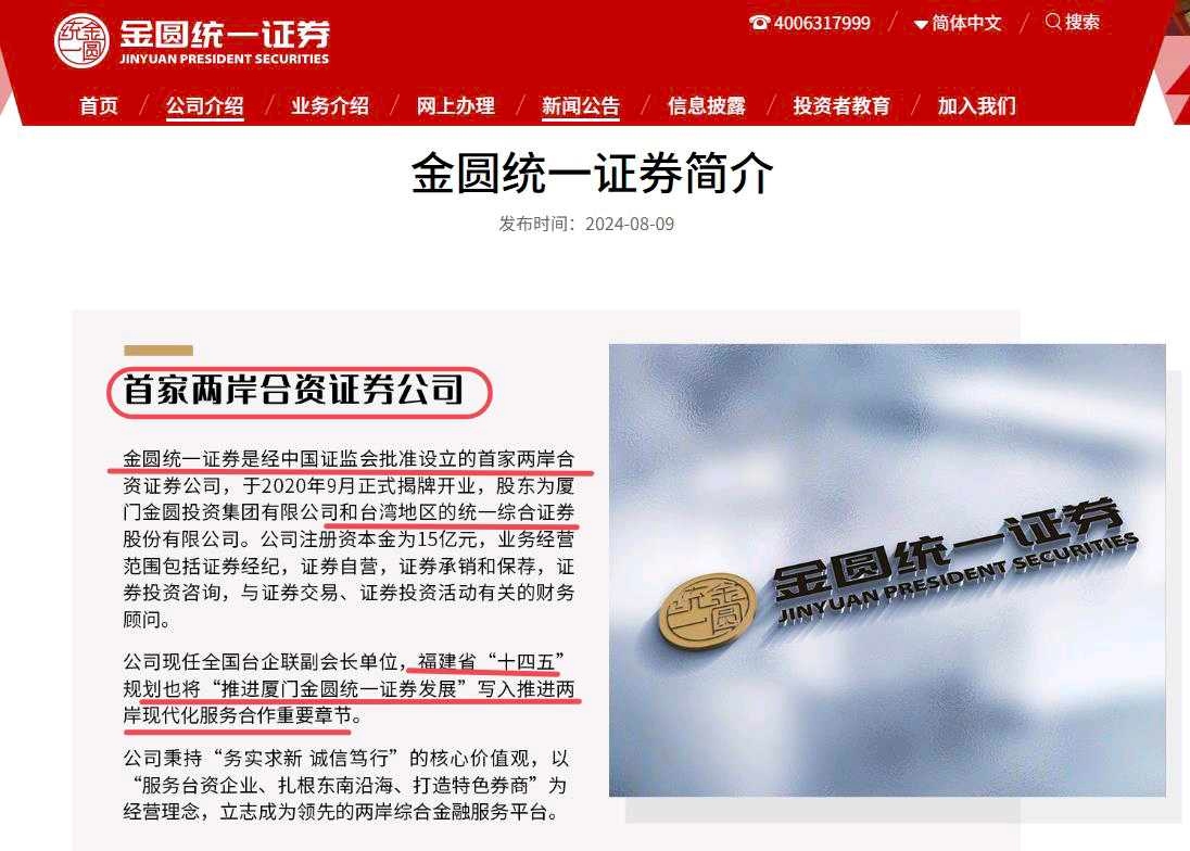 金圆统一证券是第一家获批设立的合资券商,也是海峡两岸首家合资设立的全牌照证券公司。金圆统一证券的业务发展战略是以厦门为根据、海西经济区为腹地,未来业务触角向长三角、珠三角方向延伸,目标是成为两岸金融合作的领航者与推动者。股东为厦门金圆投资集团有限公司和台湾地区的统一综合证券股份有限公司。