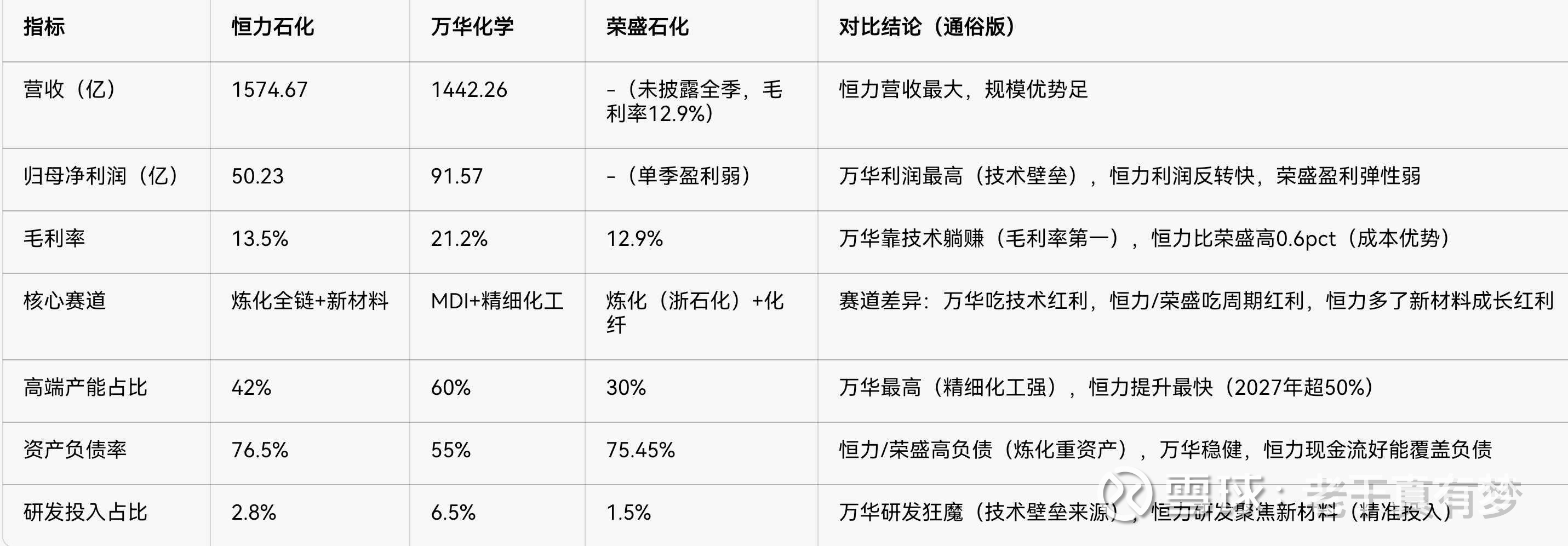 化工龙头三剑客——恒力石化(炼化全链)、万华化学(MDI技术宅)、荣盛石化(炼化规模派),基本面+竞争格局差异明显,用“通俗+数据”对比一下,我做了一张表格,这样看的清楚些,先上核心基本面对比表(2025前三季,公开数据)如图: