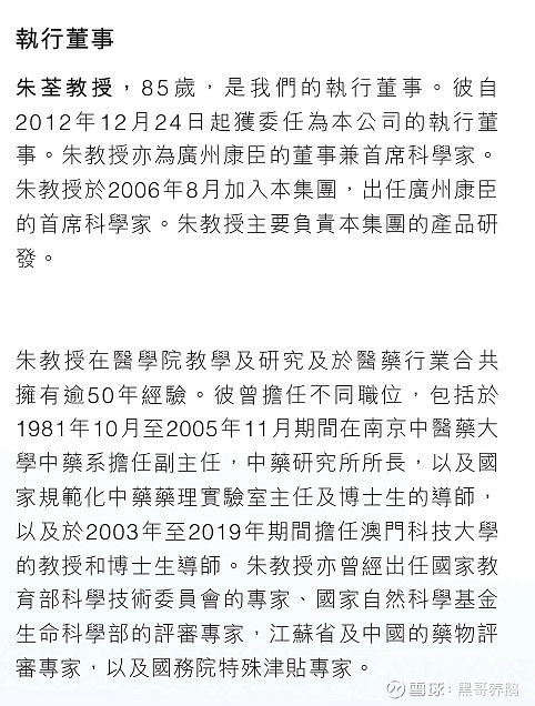 老板不是中药行业的专业人士,但是有一个86岁的老专家,担任首席科学家和执行董事,老板的老婆作为资深业内人士,在公司担任非执行董事。