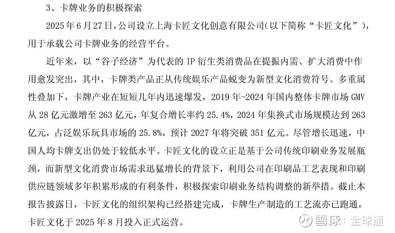 2、抓住谷子经济热点,设立卡匠文化,组织架构已经搭建完成,卡牌生产制造的工艺流亦已跑通, 卡匠文化于2025年8月投入正式运营!