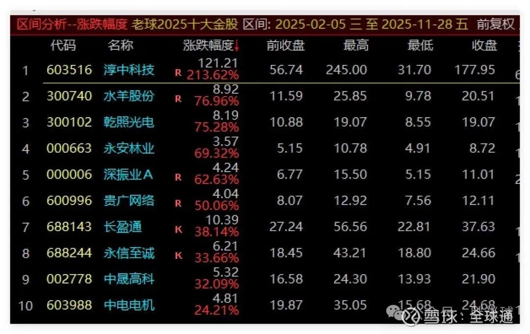 一波三折,年初受关税战的影响迅速跌到9.78,随后走出翻倍的行情,全年最高涨幅123%,作为A股唯一定位全球高奢美妆集团,水羊股份今年是关键的转折之年,如果能顺利摆脱中日冲突的影响,明年随着伊菲丹、RV、PA和美斯蒂克的快速发展以及切入生肖炒作的玄学,似乎市值目标远不止此!