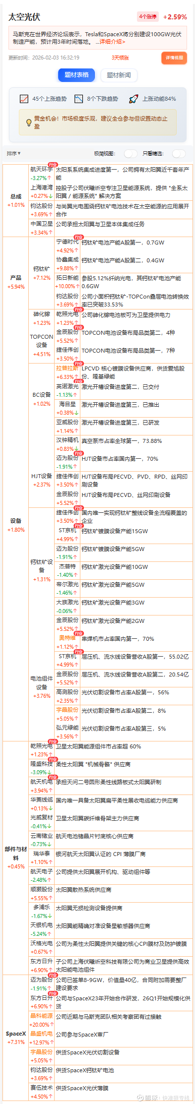 资本市场对马斯克团队中国行的反应立竿见影。2月4日,太空光伏指数盘中强势涨超3%,成分股晶科能源一度大涨近20%,TCL中环触达涨停。