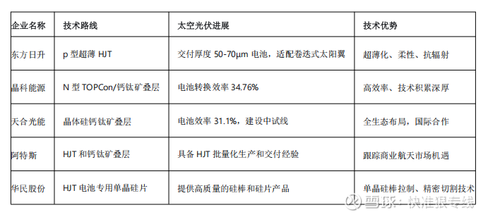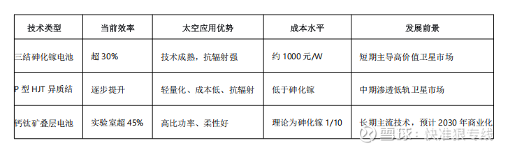 技术演进正在降低太空光伏的门槛。传统的三结砷化镓电池虽然效率超过30%,但单价高达约1000元/W。而P型HJT和钙钛矿/晶硅叠层电池凭借更低的成本优势,市场需求将迅速增长。