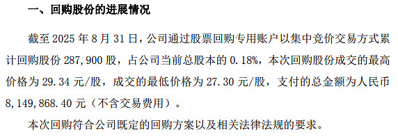 累计回购股份数量:290,000股(即29万股) 占公司总股本比例:约 0.18% 回购成交价格区间:27.30元/股 至 29.34元/股 已支付总金额:815万元人民币⚠️ 注意:此处存在一个关键矛盾点——实际回购均价远高于公告设定的16元/股上限。