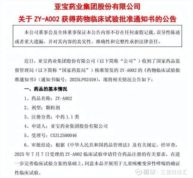 9月23日,亚宝药业发布最新公告,宣布公司收到了国家药监局核准签发的ZY-A002的《药物临床试验批准通知书》。