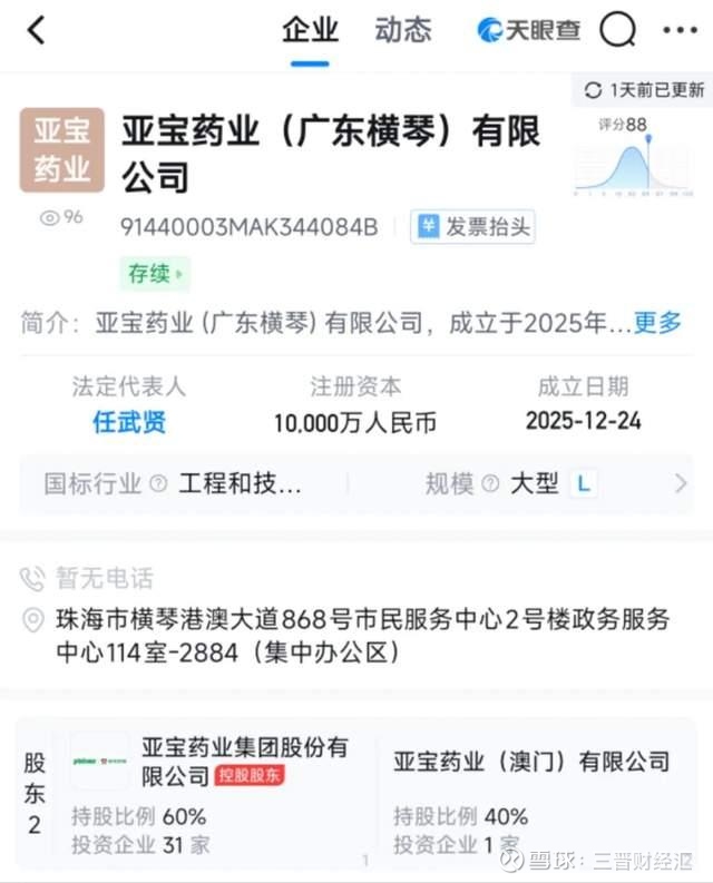 12月24日,亚宝药业(广东横琴)有限公司正式成立,该公司法定代表人为任武贤,注册资本达1亿元,登记机关为横琴粤澳深度合作区商事服务局。