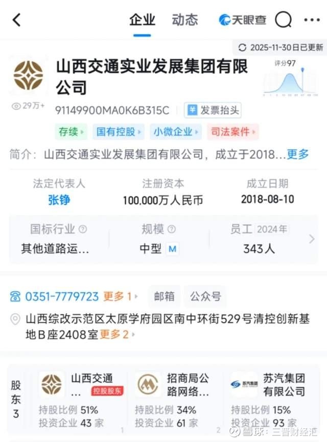 股权结构上,实业集团有三大股东,控股股东山西交控集团持股比例51%,出资2.55亿元;第二大股东招商公路持股比例34%,出资1.7亿元;第三大股东苏汽集团持股比例15%,出资7500万元。