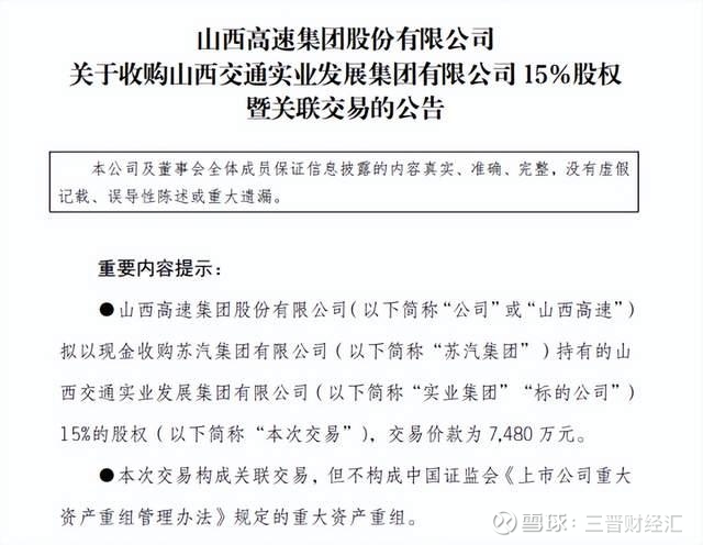 公告显示,此次股权出让方为苏汽集团有限公司(以下简称 “苏汽集团”),其基于自身发展因素考虑,拟转让所持实业集团15%的股权,山西高速拟以现金收购该部分股权,交易价款为7480万元。