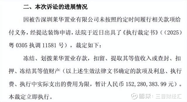2025年8月,因莱华置业未在约定时间内付款,提达装饰向法院发起申请,案件进入强制执行阶段,执行款约1.52亿元。