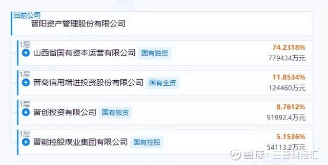 股权结构上,晋阳资管控股股东为山西省国有资本运营有限公司,持股74.23%;晋商信用增进投资股份有限公司、晋创投资有限公司、晋能控股煤业集团有限公司分别持股11.85%、8.76%、5.15%。