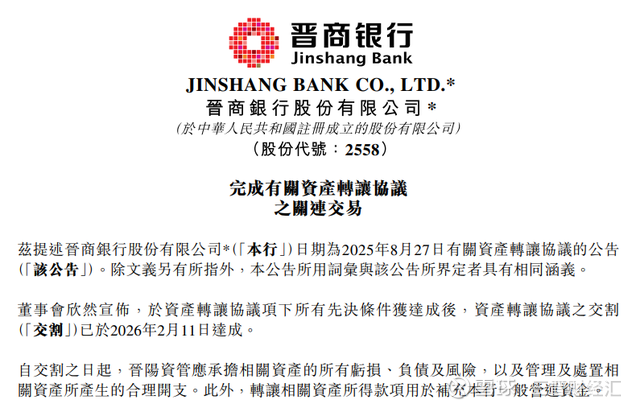 3月4日,晋商银行公告,其与晋阳资产管理股份有限公司(以下简称“晋阳资管”)签署的不良资产转让协议已于2月11日完成交割。