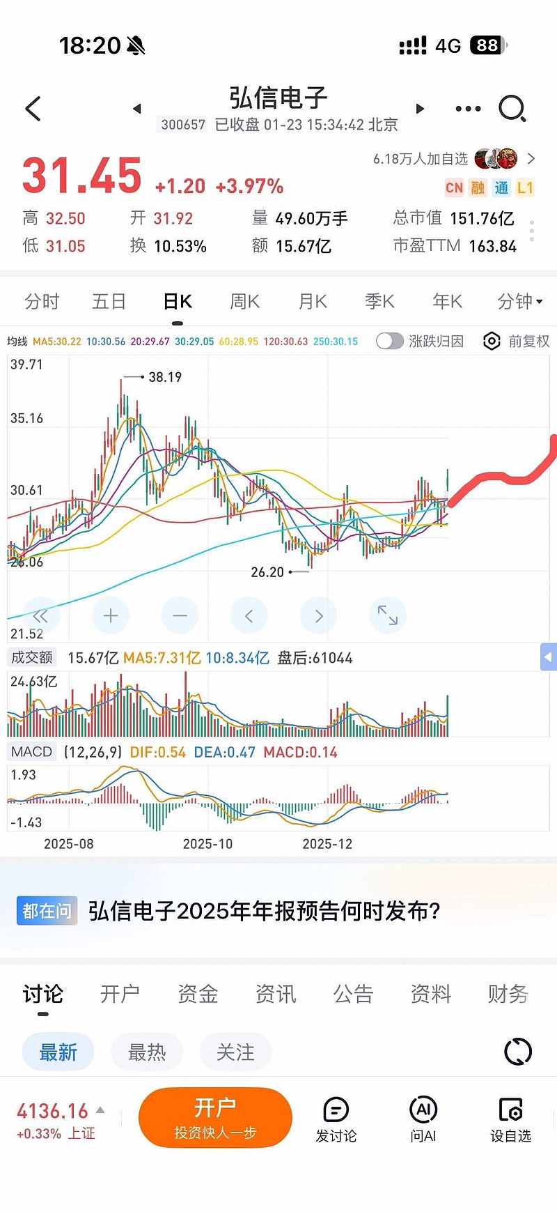 $弘信电子(SZ300657)$ 简单说几句,今天的上涨源于遂原的消息,早上十分钟资金就买得差不多了,然后水下,下午又是一两亿的拉升,全天涨幅符合预期,有人说大阴线出货,然而事实上是这是一次放量的穿顶线,32是个几个月来的强力顶,第一次捅进去,让筹码松动,让32的套牢盘跑路,后面再捅再拉升就是36-38了,第一根k线是改命,后面的k线是走趋势。切勿幻想!