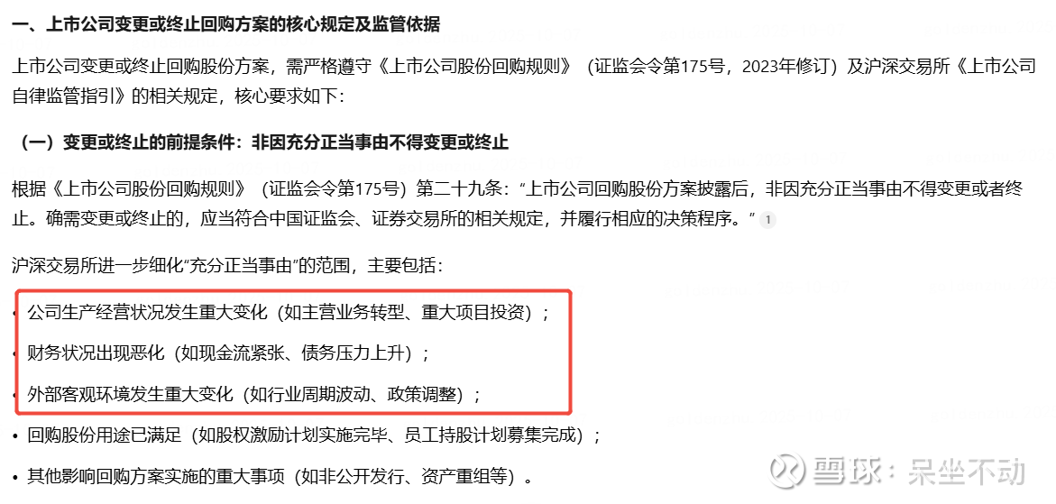 2、根据《上市公司股份回购规则》,第29条,‘上市公司回购方案披露后,非因充分正当事由不得变更或则终止。确需变更或终止的,应当符合证监会、交易所的规定,并履行相应的决策程序’。——那么露露会发生变更或终止吗?咨询腾讯元宝,实际是可能因外部环境而暂停的。