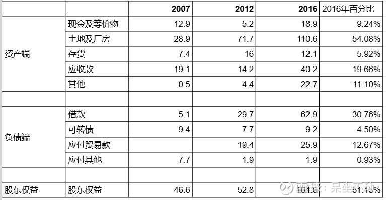 2、 以2016年数据换算,总资产中有80%是经营性质的土地/存货/应收,仅9%现金和11%其他资产。股东权益占比51%,负债端中有35%有息负债、12%占用下游果农资金