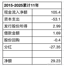 为什么是”赚小钱“呢?我们来看看2015年至2025年的经营情况:累计流入105亿,投入厂房与土地53亿,剩余52亿左右。期间向管理层和员工增资扩股吸收资金2.99亿,分红27.35亿,剩余27.35亿在企业中继续运营。