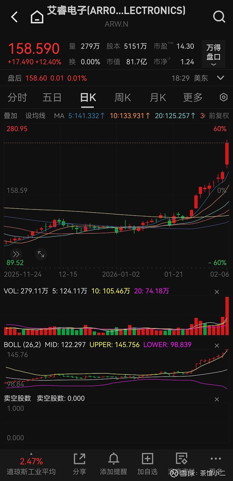 #艾瑞电子# #商络电子# #mlcc#美股主被动元器件分销第一股艾瑞电子近期趋势,全球范围主被动元器件都在涨价,分销商四季度业绩普遍有比较夸张的涨幅,更加确信商络电子这一纸减持以及大盘情绪下杀可能带来的机会