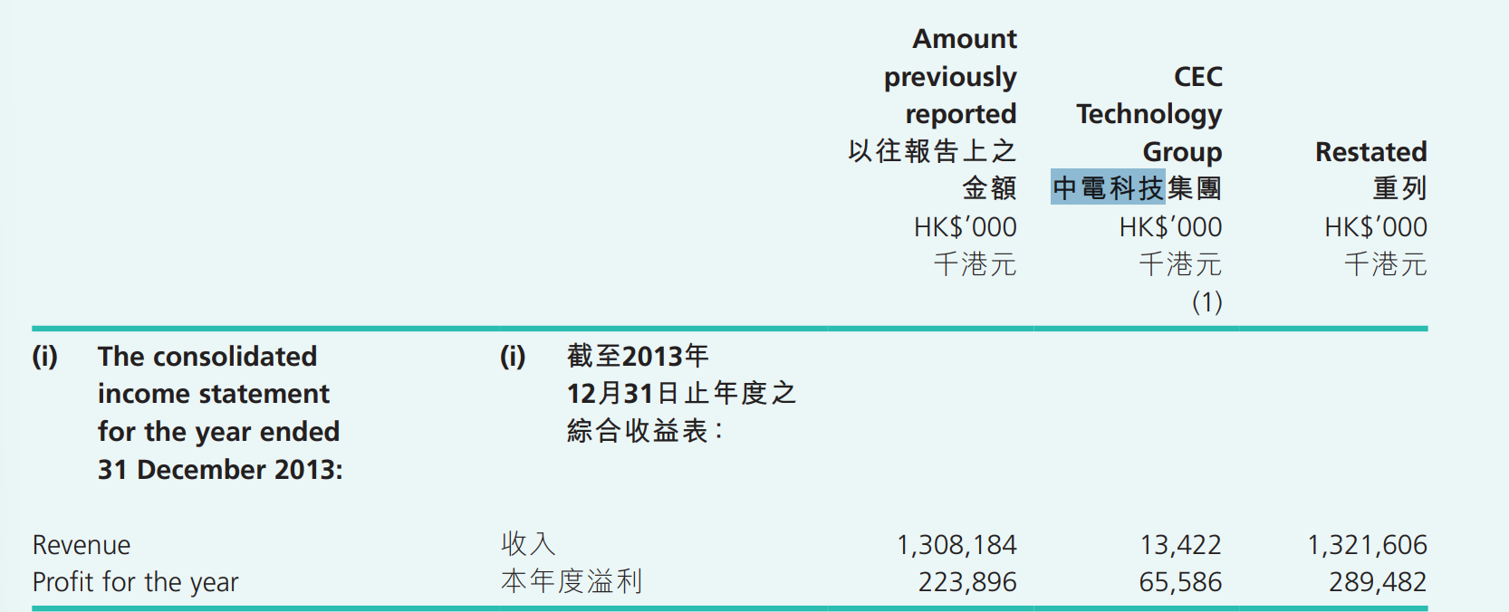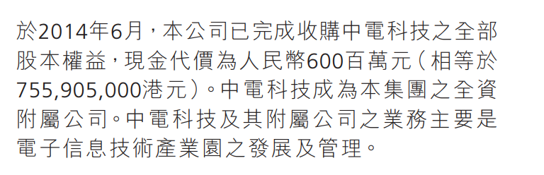 需要注意,中电科技是公司2014年花了7.6亿港元刚刚收购过来的,合并报表后增厚了6500万港元利润。