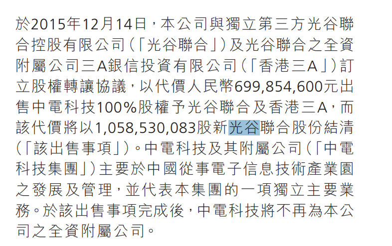 一、2015年收购$中电光谷(00798)$ (“光谷”被华大收购前,叫光谷联合,后改名中电光谷。):