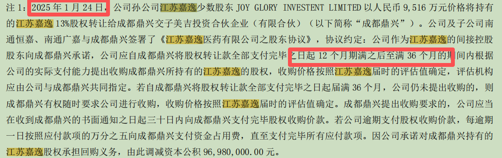 公司持有江苏嘉逸87%股权,少数股东2025年1月做了股权转让,公司对新股东有回购协议,期限为1-3年。